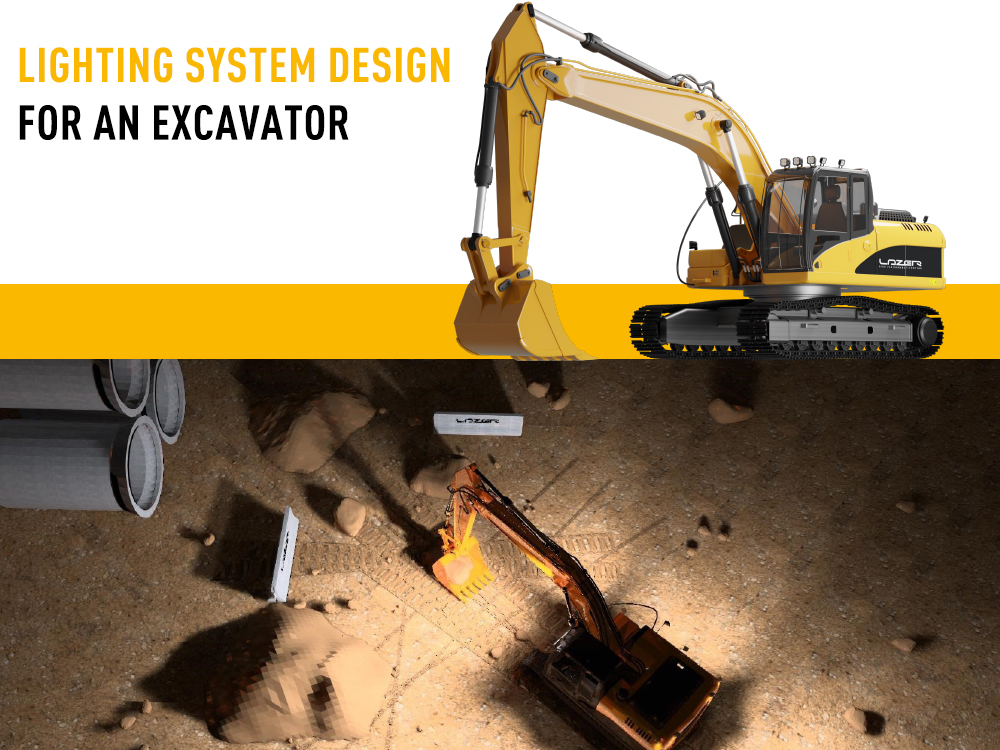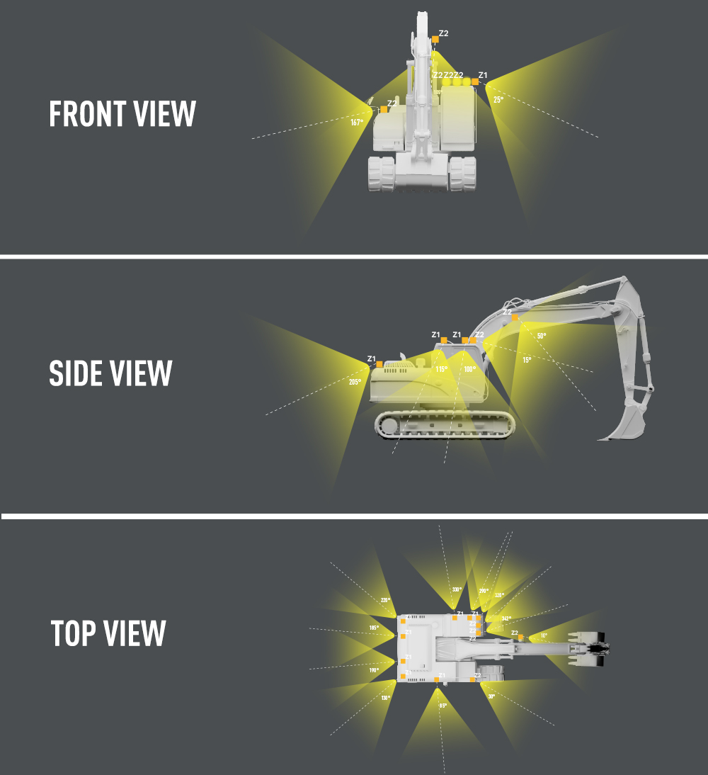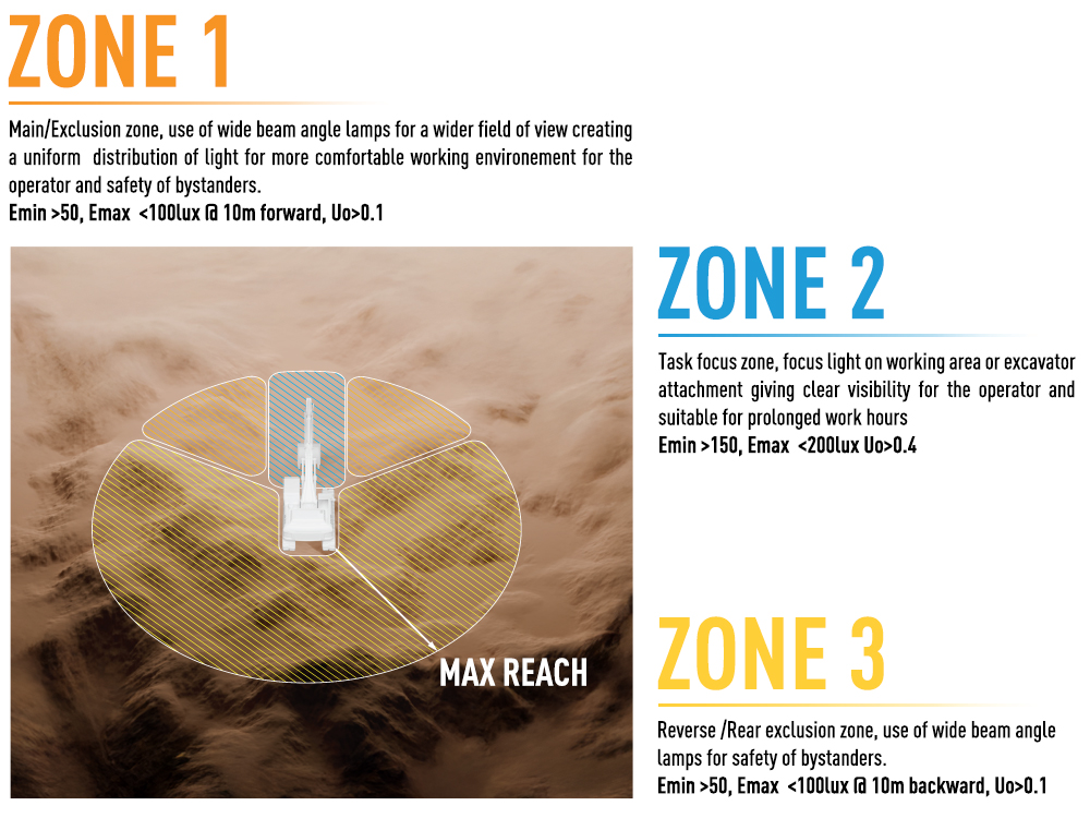 At Lazer, we leverage our expertise and advanced lighting analysis tools to work within the defined lighting zones. This enables us to recommend the ideal lamp selection, vehicle positioning, tilt angles, and beam configurations, ensuring optimal and performance. When deciding which zones to illuminate and to what extent, the operator should consider both the areas where tasks will be performed and those required for the safe movement of pedestrians or other workers. For excavators we have indetified the following 3 key zones: