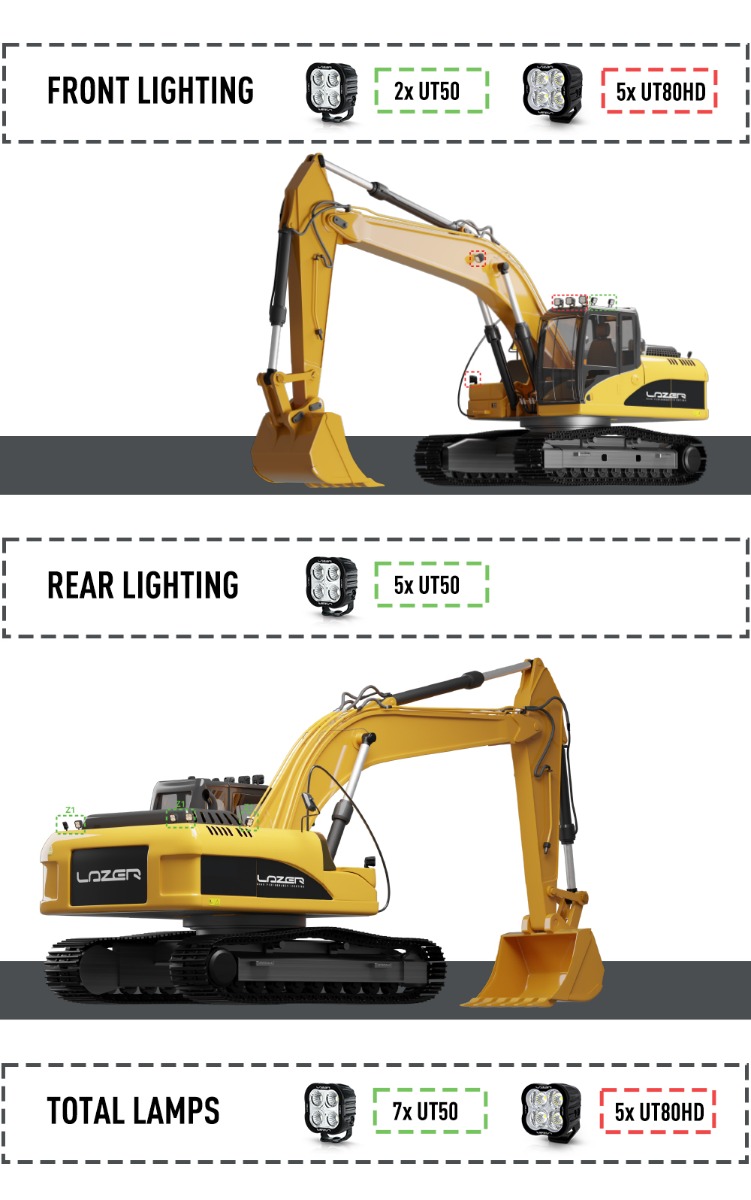 For more information on these products, and to see the lighting performance of alternative front lighting set ups suitable for an excavator - please see the sections below. For any further questions - please dont hesitate to get in touch via our social media or contact us directly: +44 (0)1992 677374 / sales@lazerlamps.com