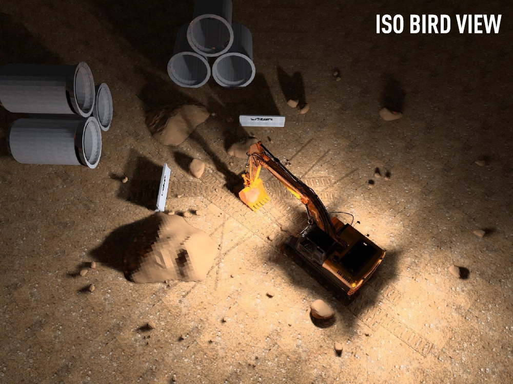 The following simulations visualise the exact light output achieved by the case study set up, demonstrating the combination of front and rear lighting and the distribution of light in the key zones in front off and around the excavator.