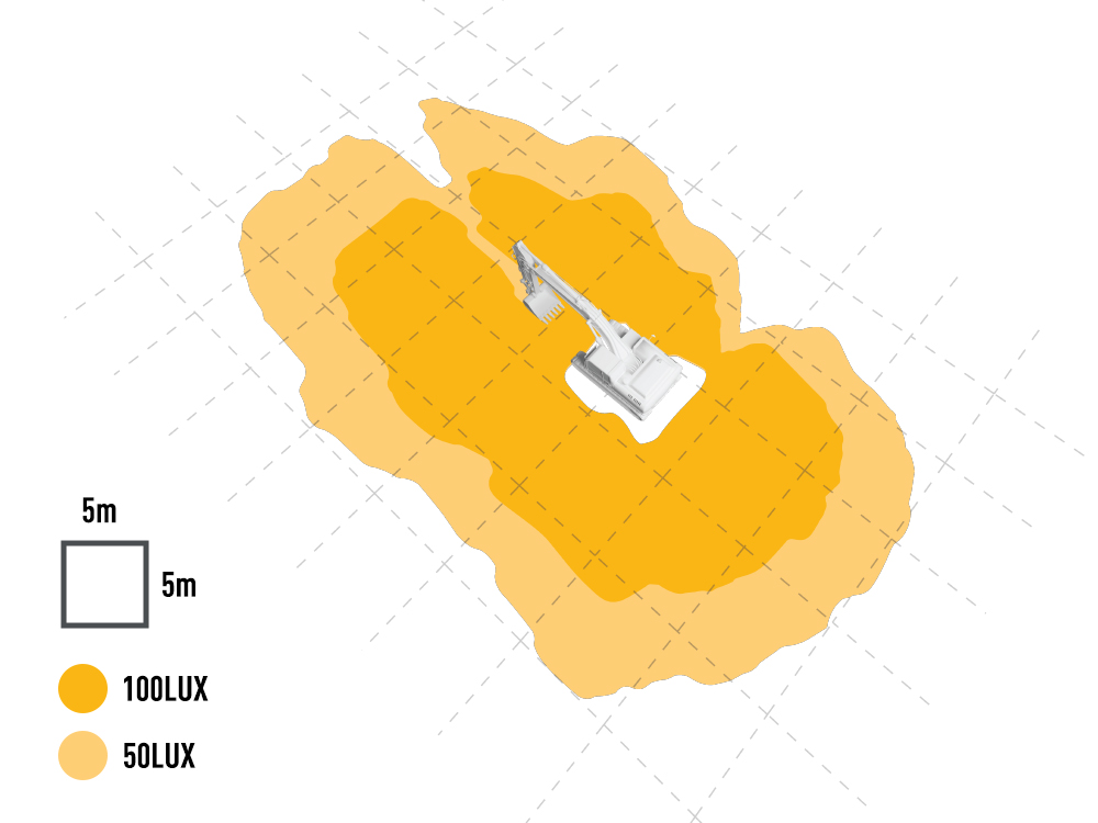 Recognising the European standard: EN12464-2, which defines minimum safe illumination of between 20lux-200lux for outdoor excavator work, we have carefully designed the following lighting setup, which is based on achieving the best spread of light taking into account the key zoning parameters and the optimal illuminance within them. Ensuring the side and rear of the excavator have clear visability is also Essential for maintaining a safe working area, our rear set up follows HSE HSG38 guidelines - which define the range of illuminance around the vehicle between 50lux-100lux.