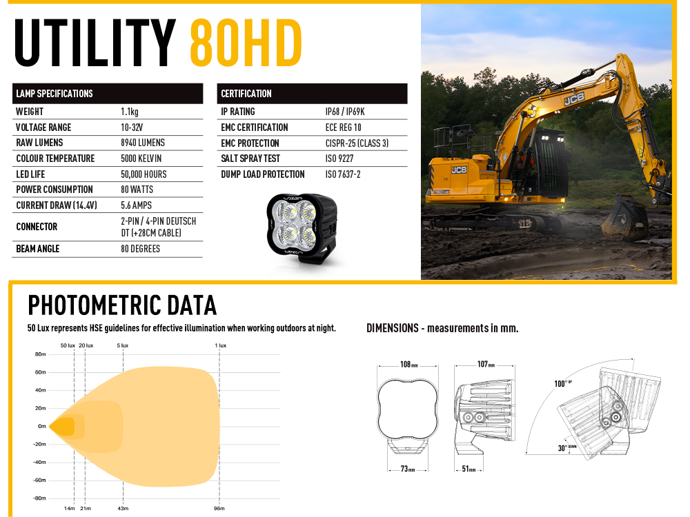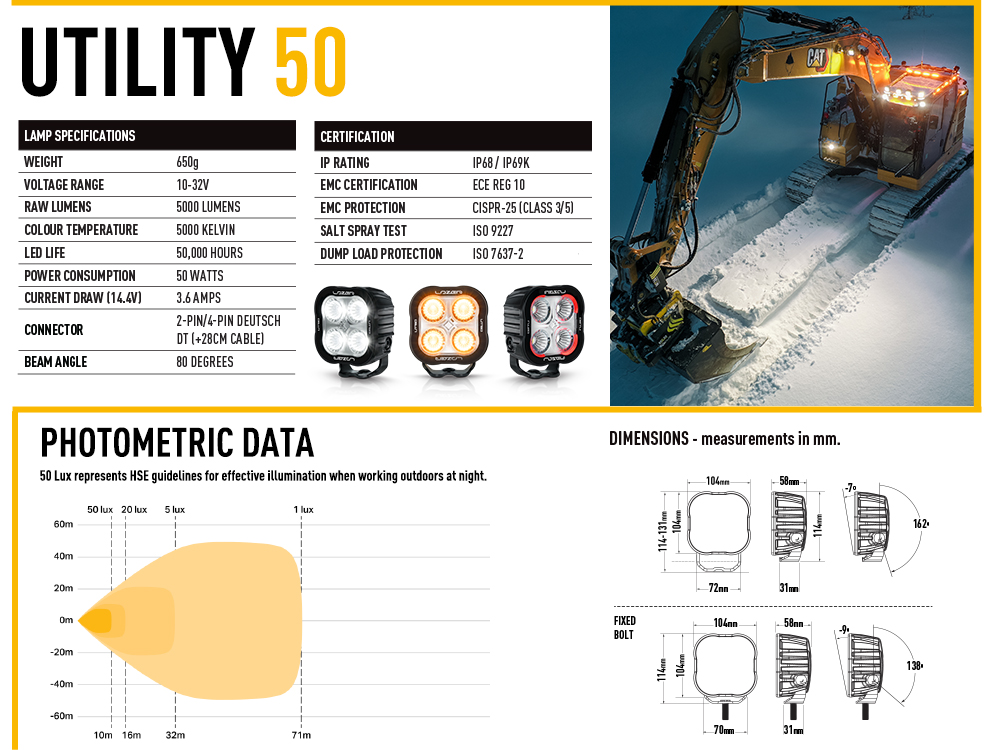 By working closely with operators and understanding their day-to-day challenges, we've developed high-performance work lights that are tailored to real-world demands. Our Utility Series offers a robust range of work lights, available in 25W, 45W, 50W, 80W & 170W variants. Models are also available with additional functions such as variable brightness settings, red tail-light, and beacon/strobes - ensuring there’s a solution for virtually every industrial application.