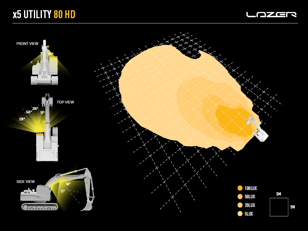 In summary, from the simulation and case study results - we can see this set up is achieving excellent levels of lighting (>100 Lx) in a wide area around the excavator, with an otpimal level of light uniformity across all required zones. The light output is crucal but we can also see the strategic positioning of theese lamps is also key to to optimise coverage and uniformity for the operator. This result is achieved using 12 lamps in total, comprising 5 × Utility-80 HD and 7 × Utility-50 lamps.