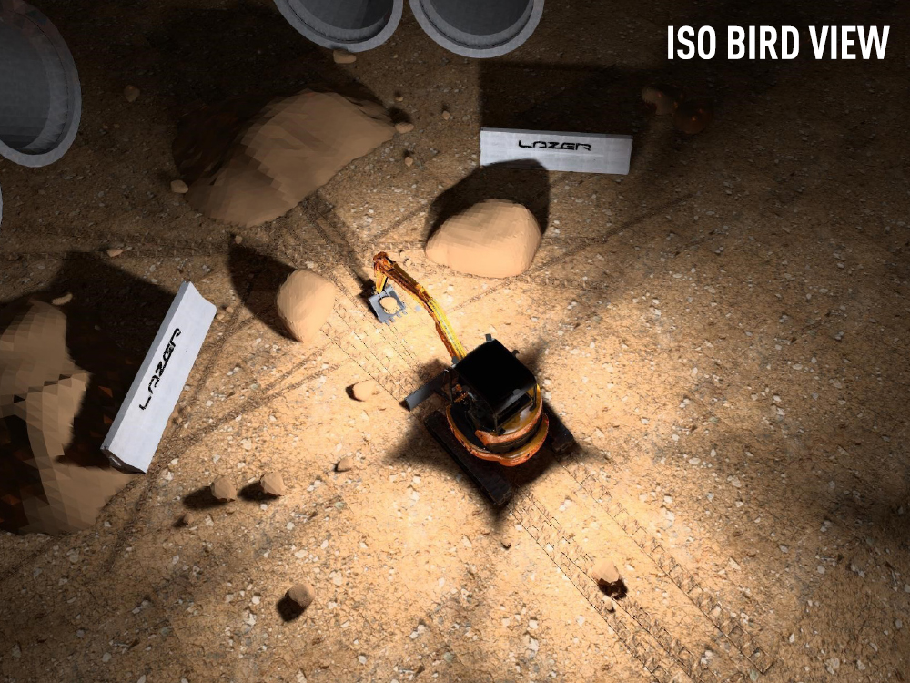 The following simulations visualise the exact light output achieved by the case study set up, demonstrating the combination of front and rear lighting and the distribution of light in the key zones in front off and around the excavator.