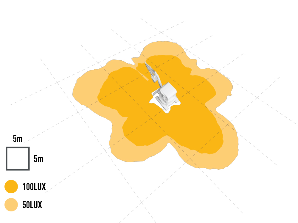 In summary, from the simulation and case study results - we can see this set up is achieving excellent levels of lighting (>100 Lx) in a wide area around the mini digger, with an otpimal level of light uniformity across all required zones. The light output is crucal but we can also see the strategic positioning of theese lamps is also key to to optimise coverage and uniformity for the operator. This result is achieved using 7 lamps in total, comprising x4 Utility-25 MAXX and ×3 Utility-25 lamps.