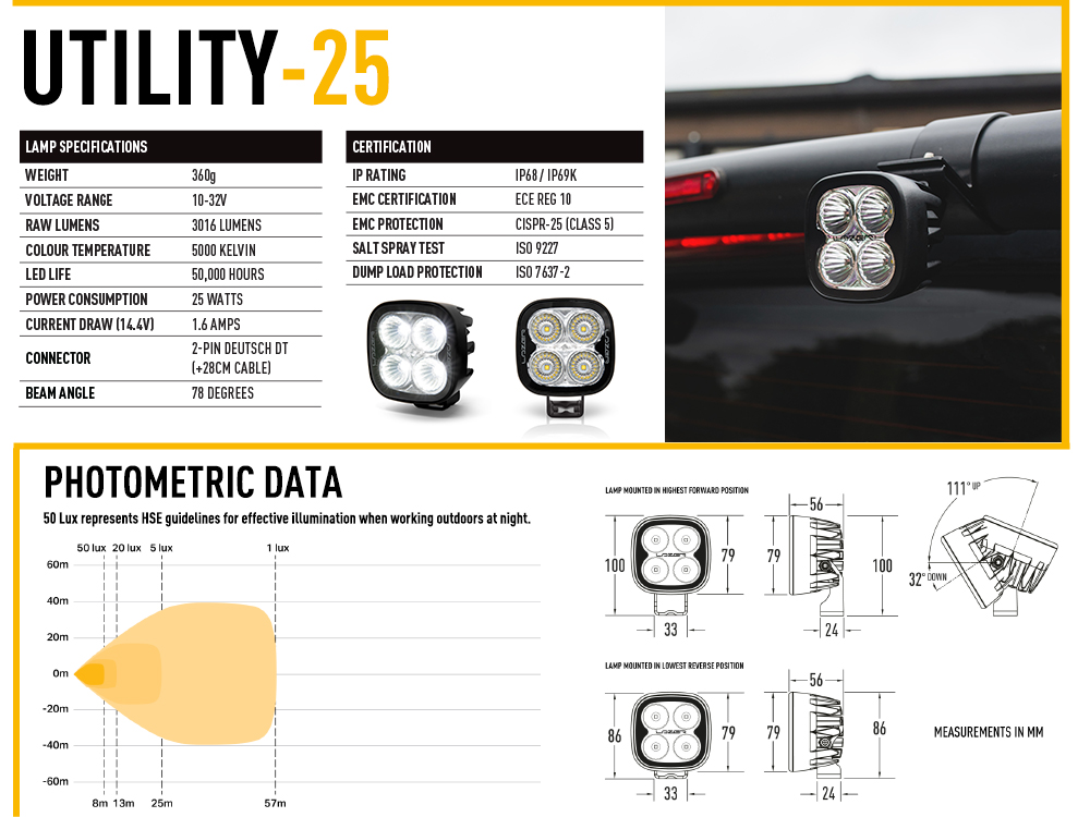 By working closely with operators and understanding their day-to-day challenges, we've developed high-performance work lights that are tailored to real-world demands. Our Utility Series offers a robust range of work lights, available in 25W, 45W, 50W, 80W & 170W variants. Models are also available with additional functions such as variable brightness settings, red tail-light, and beacon/strobes - ensuring there’s a solution for virtually every industrial application.