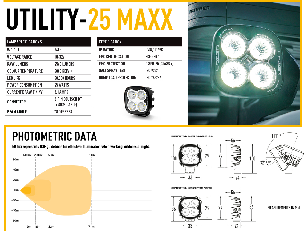 At Lazer we are proud that our Utility Series of work light solutions are trusted across the world in key industrial sectors such as construction, agriculture, mining, and forestry. As a UK brand with all our design, engineering, and manufacturing done in-house, our lights are built to the highest standards. The result is solutions that not only deliver incredible lighting performance and durability, but improve safety, visibility, and efficiency in critical scenarios.