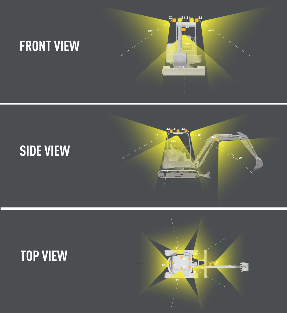 At Lazer, we leverage our expertise and advanced lighting analysis tools to work within the defined lighting zones. This enables us to recommend the ideal lamp selection, vehicle positioning, tilt angles, and beam configurations, ensuring optimal and performance. When deciding which zones to illuminate and to what extent, the operator should consider both the areas where tasks will be performed and those required for the safe movement of pedestrians or other workers. For mini diggers we have indetified the following 3 key zones: