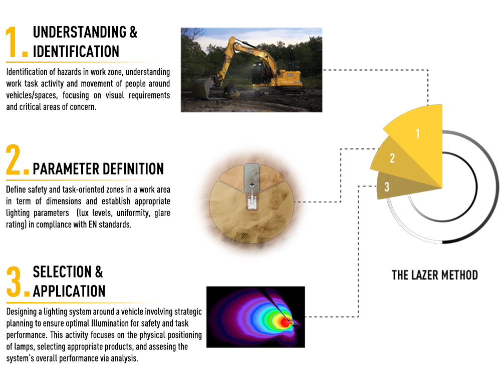 The Lazer Method: 3-Phase Process: To develop our reccomended lighting set ups and understand what combination of lights would achieve the best results, we work from a 3-Phase Process. The first step is to understand the challenges and identify the hazards that operators face. Then we can develop the lighting parameters, which involves understanding the optimal distribution of light in the areas surrounding the machine, to best meet the operators needs and mitigate hazards. The final step is utilising our innovative software to simmulate different lighting systems outputs, to find the set up that achieves this light distribution.